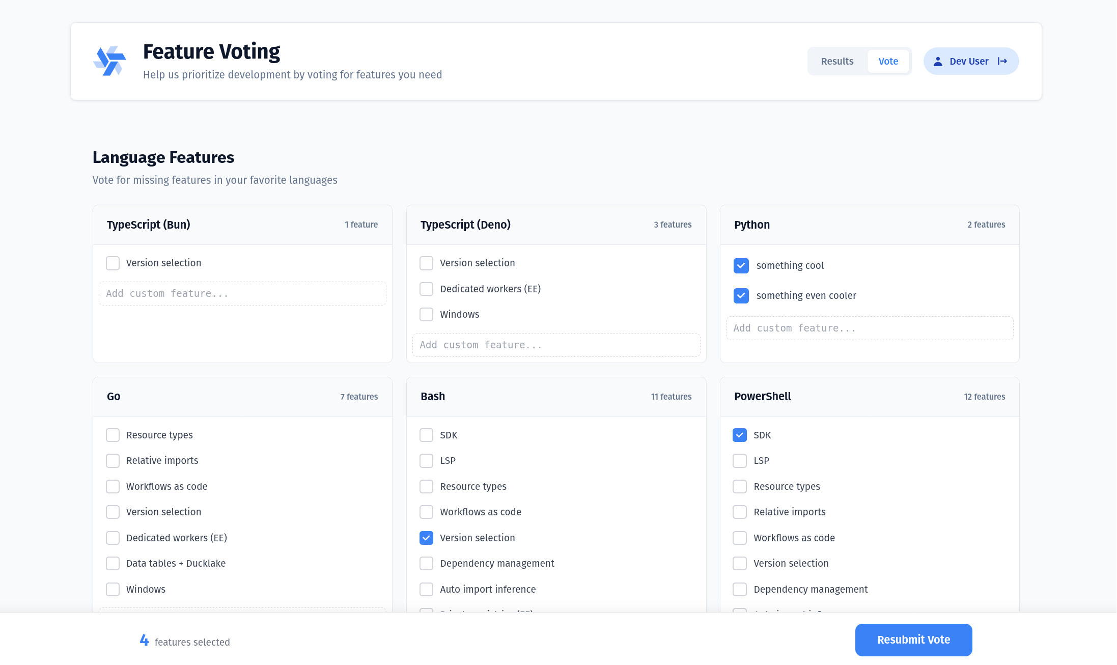 Vote for the next features and languages you want to see in Windmill. Help us prioritize what to build next by casting your vote. You need to be logged in to vote.
